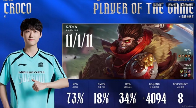 第三局Monki塞拉斯还想抓下,但是被Croco猴子反蹲成功,1xn伊泽瑞尔双杀之后早早对位拿下一千优势,让About希维尔根本对不了线啊!中期LNG连续拿小龙给足压力,WE则是上中单带没让经济差被扩大!连续几波团战BuLLDoG佐伊睡眠气泡连续命中,Monki塞拉斯猛偷卡尔玛大招团战端毫无作为!LNG连拍三次大龙钓鱼成功,赢团拿下大龙+炼金龙之后逼WE接远古龙团,sheer凯南连续天雷命中多人配合队友完成收割,Croco猴子11杀11助完成超神,LNG扳回了一分!