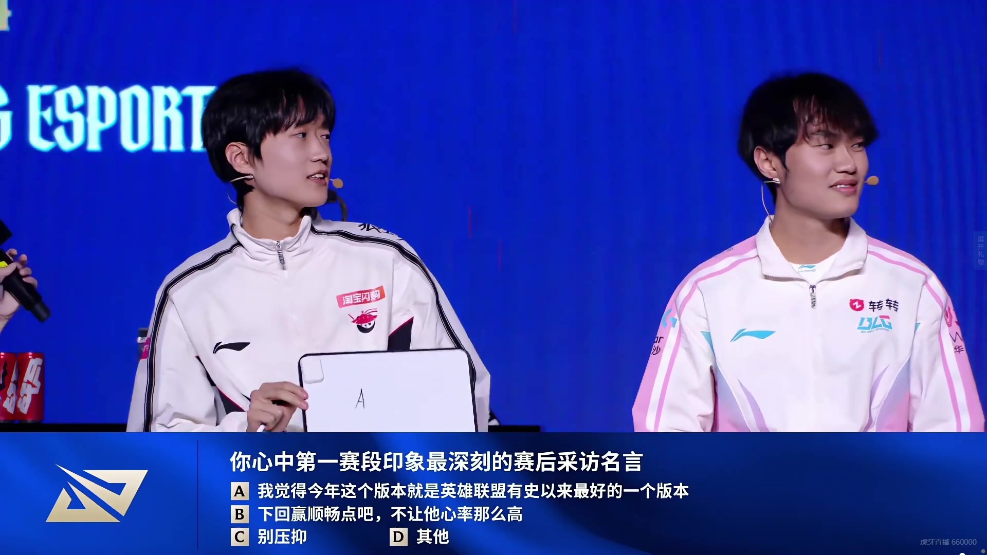 直播吧2月11日讯 第一阶段季后赛前的选队仪式,主持人提问心中第一阶段印象深刻的赛后采访名言,Shanks选A并表示评论很搞笑,Bin哥这版本开局领先2刀。而小虎直接举牌世一上。