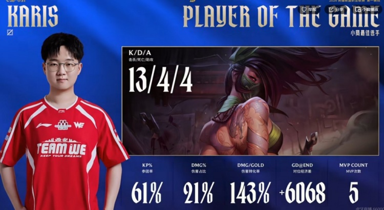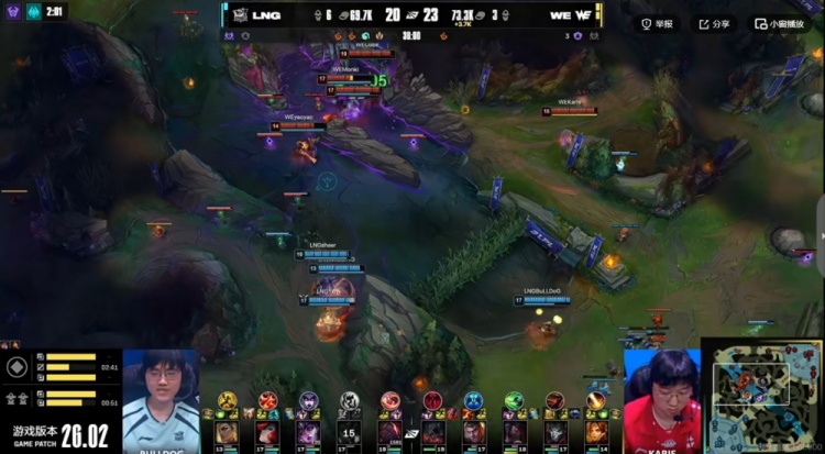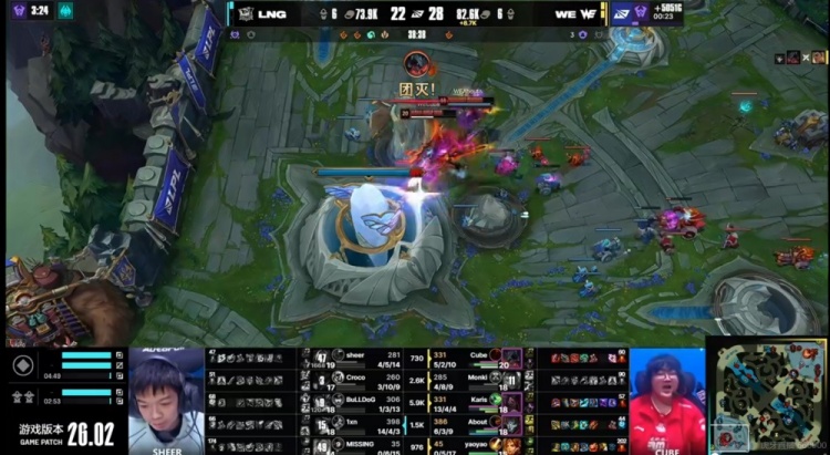 中期双方有来有回,LNG先行拿下火龙魂,Croco卡兹克连续舍命切后排让LNG一度看到了获胜的希望!但是关键时候他遭遇Karis阿卡丽被戴帽的阿卡丽反杀,WE成功拿下大龙!最终团战Croco卡兹克大绕后效果不佳,正面WE集火逐个击破,团灭LNG强拆基地终于可以结束比赛!这样WE就击败LNG成功晋级季后赛!