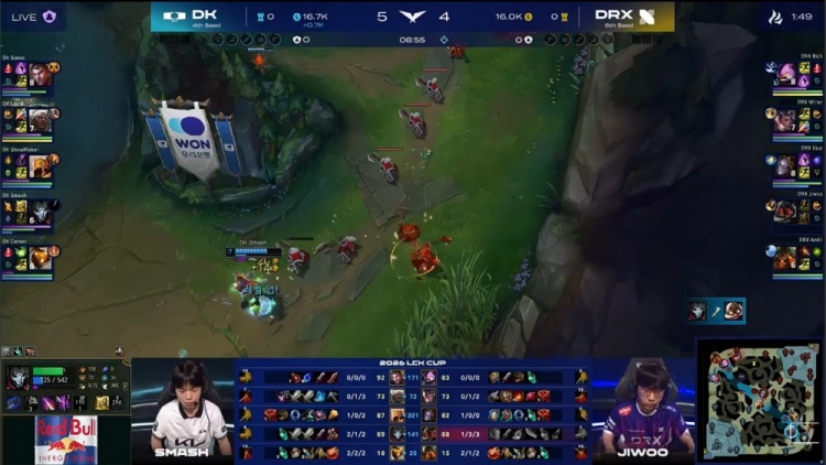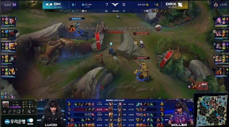 中期Lucid安蓓萨入侵被抓,Siwoo杰斯接连阵亡,DRX河道团打出0换2并推掉DK中一塔,经济领先1k。紧接着小龙团DRX再打1换3,将差距扩大到2k。