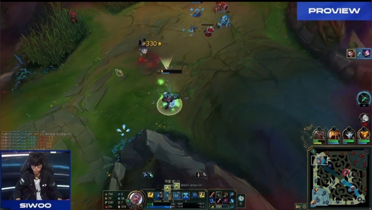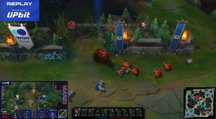 【10:21】河道团战,Smash烬先点掉Jiwoo,随后Smash野区架狙,Andil泰坦保住Jiwoo,上路Rich凯南线上开大想杀Siwoo,后者杰斯锤形态双抗顶住反手单杀Rich。