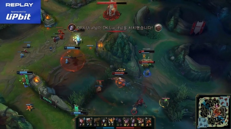 【8:09】Lucid安蓓萨带队进DRX野区反蓝,Career巴德被Andil泰坦钩住后送出人头,随后Smash烬下路单杀Jiwoo飞机,同时Willer赵信去上联手Rich凯南轻松越掉没闪的Siwoo。
