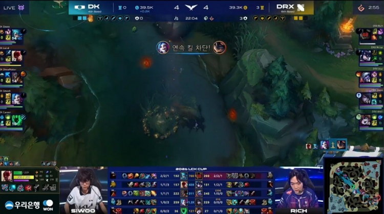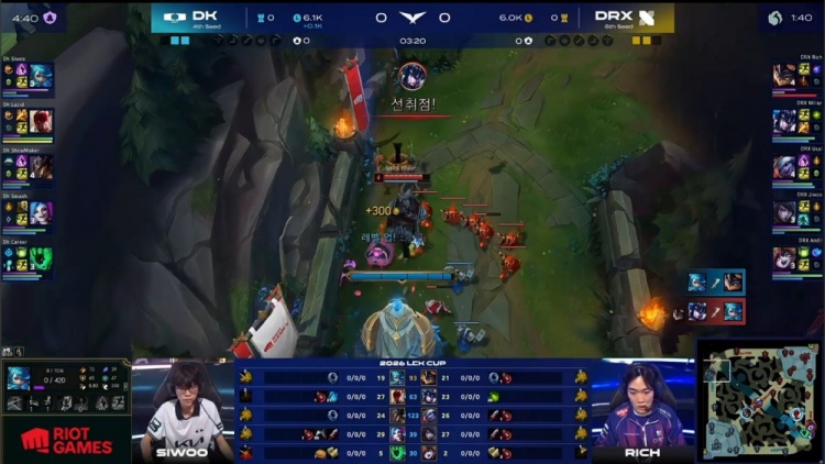 中期双方中路与河道互换人头,Rich兰博河道草丛烧烤单杀Lucid盲僧。紧接着Siwoo格温下路单杀Rich找回场子。随后DK野区打出0换3并拿到大龙,经济领先6k。