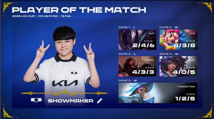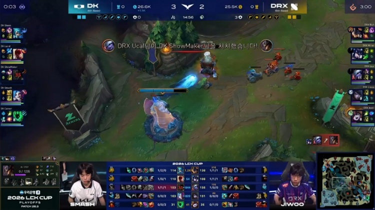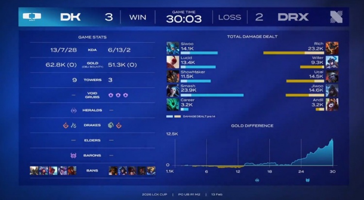 直播吧2月13日讯 2026LCK Cup季后赛继续进行,DK鏖战五局以3-2战胜DRX!