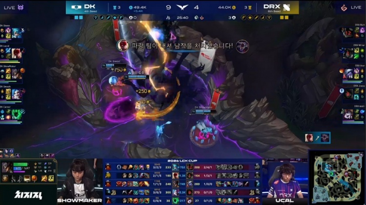 后期中路团战Ucal小炮送Smash金克丝启动,Smash金克丝爆轰四杀,DK轻松一波推平DRX基地拿到比赛胜利。
