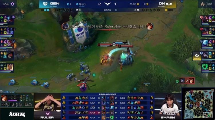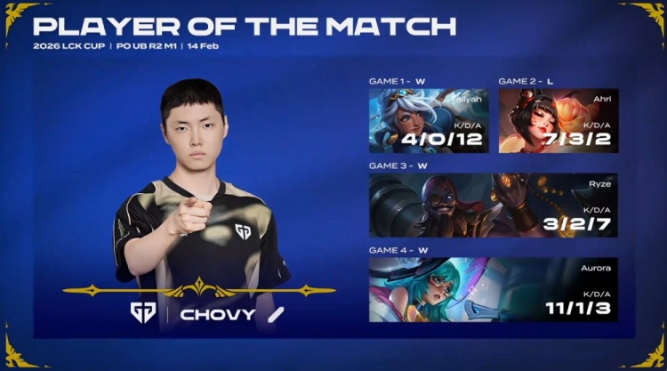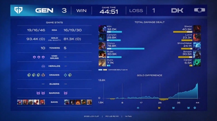 直播吧2月14日讯 2026年LCK杯进入季后赛阶段,胜者组第二轮的首场比赛将是GEN3-1战胜DK!