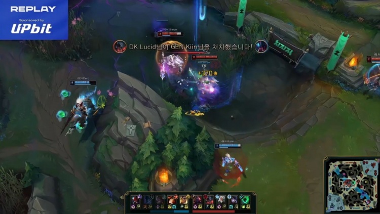 【11:28】下路三角草3v3,Canyon梦魇关灯,Ruler女枪隔墙开扫融化Smash,Career钩小龙被杀再死一次,上路Siwoo赛恩塔下单杀Kiin雷克塞,GEN整体打出1换2。