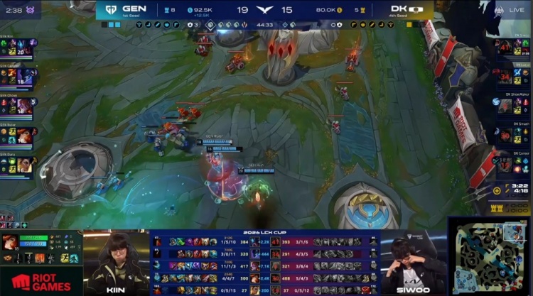 中期小龙团Canyon梦魇与Chovy阿萝拉先手击杀许哥冰鸟,但Kiin雷克塞又被集火。DK在小龙团打出0换3并吃掉大龙,经济反超2k。后续GEN下路包夹DK,Kiin雷克塞TP绕后配合Canyon梦魇打出1换3并拿到小龙,经济反超1.2k。