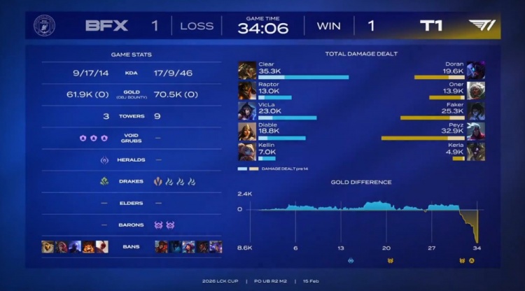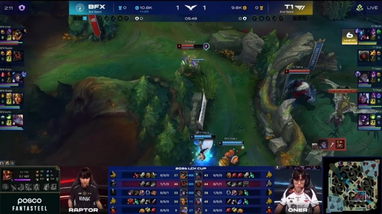 直播吧2月15日讯 2026 LCK CUP季后赛继续进行,今日T1对阵BFX!