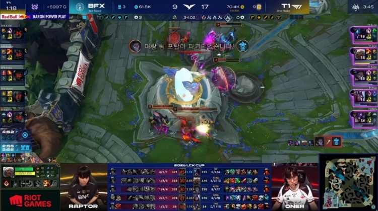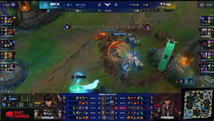 第二局前期双方打野河道互换,上路Clear鳄鱼单杀多兰雷克塞,随后Raptor皇子来中屏幕外火锅扣掉Faker,BFX经济领先2.2k。