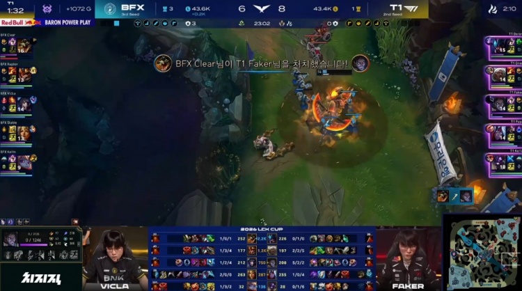 中期大龙团,T1四人包夹击杀BFX中野,T1打出0换2拿到大龙,双方经济持平。随后Clear鳄鱼下路死刑宣告在手单杀Faker塞拉斯,BFX经济领先1k。
