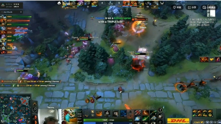 天辉Spirit:Collapse半人马、rue森海飞霞、Yatoro矮人直升机、panto发条技师、Mirele虚无之灵