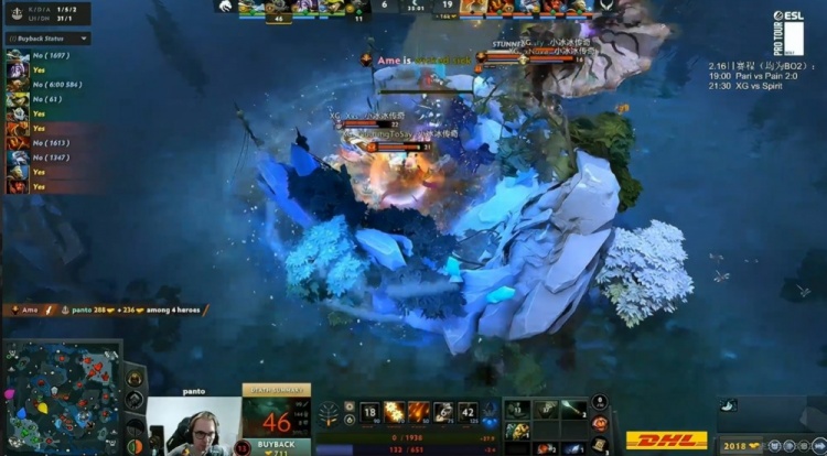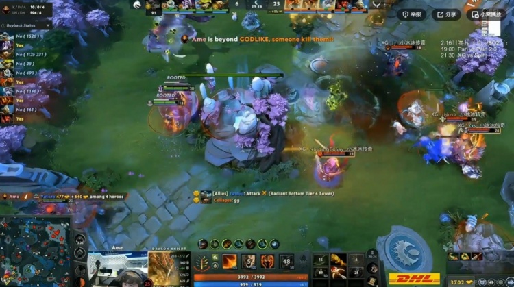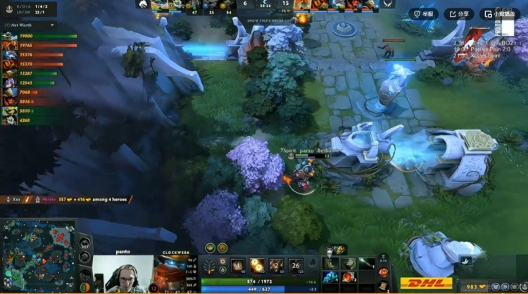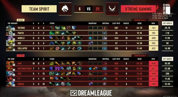 【22分钟】XG下路动手,配合NTS火猫切后排再次强杀掉了Collapse人马+rue松鼠!这波0换2打完XG成功拿下一代肉山,Ame龙骑士带盾,想做坏事的panto发条还被Fy毒狗一个关找到了!不过回头Spirit四人在中路借助Yatoro飞机大炮输出秒掉了NTS火猫+xNova百戏大王,瞬间打回2K经济差啊!