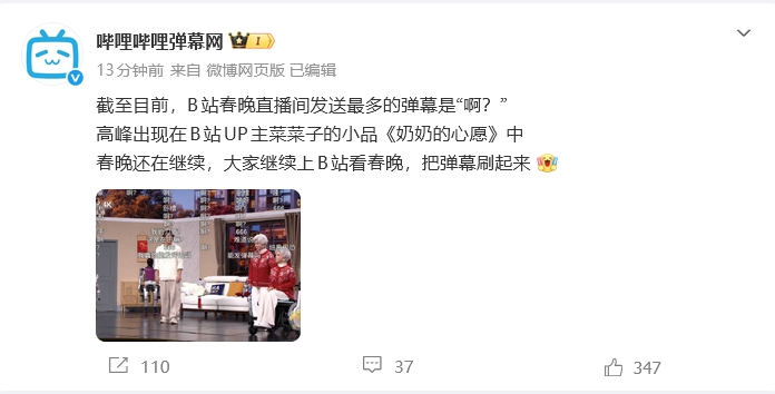 截至目前,B站春晚直播间发送最多的弹幕是“啊?”