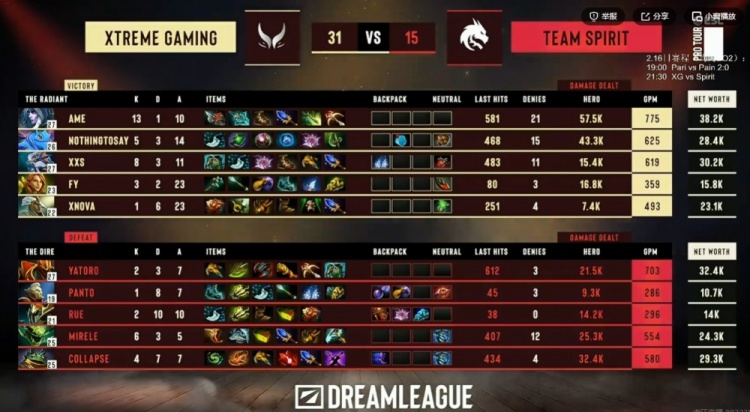 【49分钟】下路Collapse朗戈直接被秒没买活,panto百戏大王买一送一买活死了啊!XG抱团下路上高秒掉Mirele毒龙又逼一个买活!XG拆掉中下高地之后再转上逼出塔防,正面NTS帕克吃不住龙骑伤害被秒交出买活!但是正面xNova陈A杖配合队友强杀掉了Yatoro龙骑士+Mirele毒龙买活死!XG团灭Spirit结束比赛!拿下首日开门红!