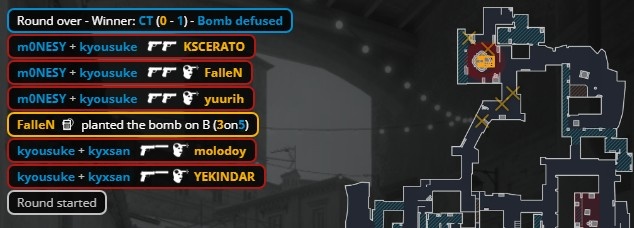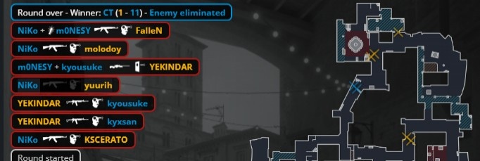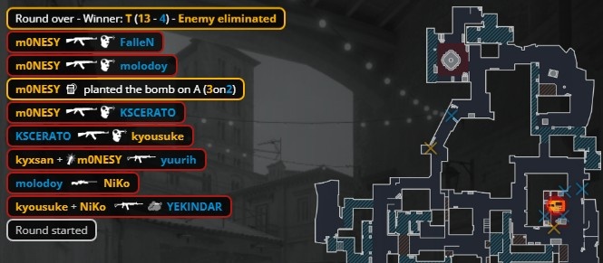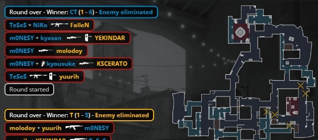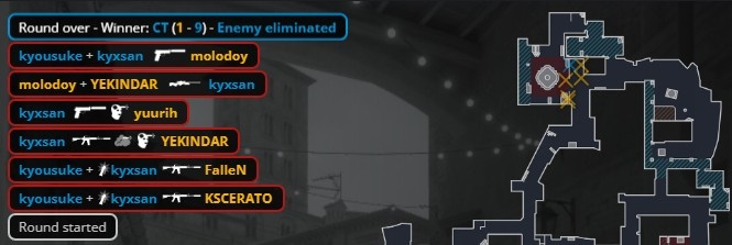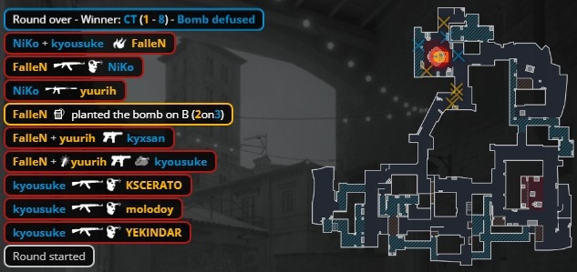 第9回合黑豹叫出第一个暂停,暂停回来,香蕉道京介AK三杀被换,教父拿回AK再杀K3拿到双杀,Niko双杀yuurih与教父联手京介双人五杀,猎鹰拿到第8分。