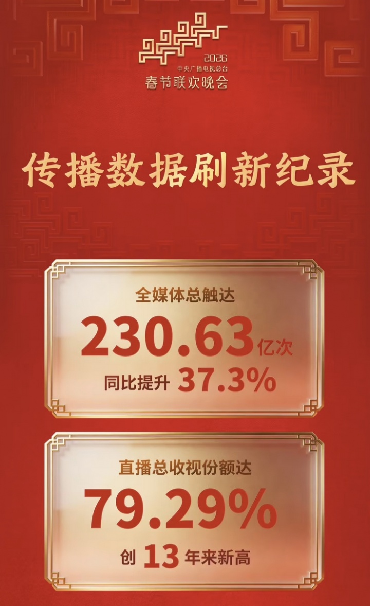 在全国电视市场的直播总收视份额达 79.29%,创 13 年来新高。春晚播出期间,平均每分钟同时在线收看(收听)人数达 3.25 亿人,同时在线收看人数峰值破 4 亿人。