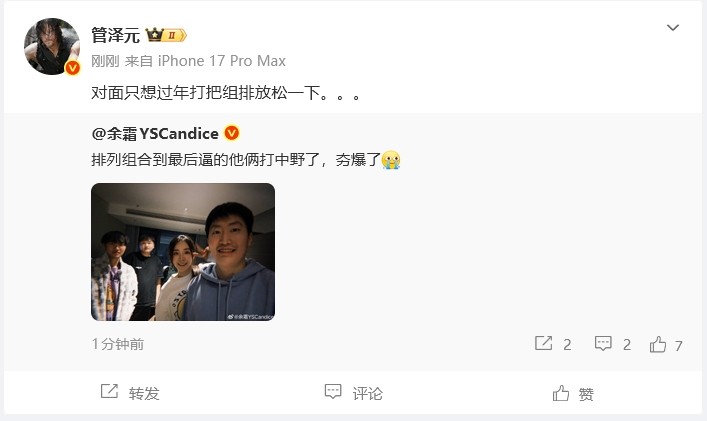 直播吧02月18日讯 管泽元/余霜夫妻二人在社媒晒出一张照片,管泽元在过年期间来到余霜老家,并与Yagao、Knight两任BLG中单选手一起打LOL组排。