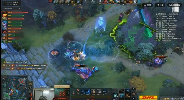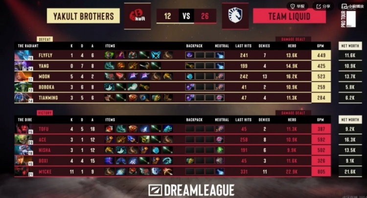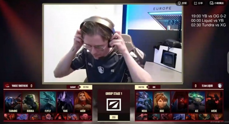 31分钟Liquid再拿魔晶,拉开经济差到11K!33分钟flyfly水人上路河道打钱被抓买活死,Liquid再度上高想拆三路,Ace潮汐一个跳大配合龙骑贴脸瞬秒MooN莉娜,双大哥倒下YB也敲出GG!小组赛0-4开局!