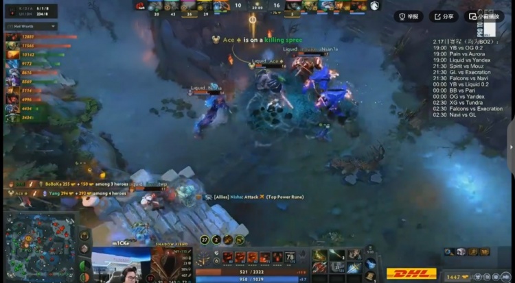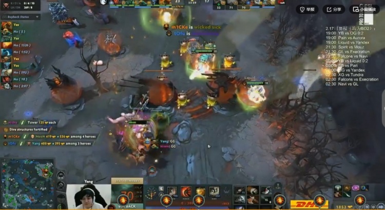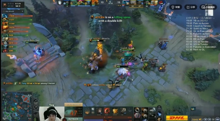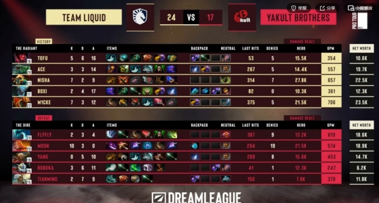 开局对线YB强杀m1CKe影魔拿下一血,但是随后7分钟YB下路团战强杀对手双酱油之后还抢了对手经验符!不过Liquid也连续针对到了Yang黑贤,连续将他击杀!16分钟中路团,Boboka土猫被秒,YB反手集火但是有t0fu玛西抱走大哥!Yang黑贤拉墙三个但是输出不够,没人管的m1CKe影魔配合队友收割,Liquid打出1换5团灭YB,领先5K!