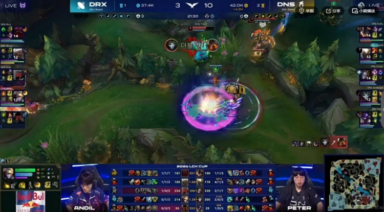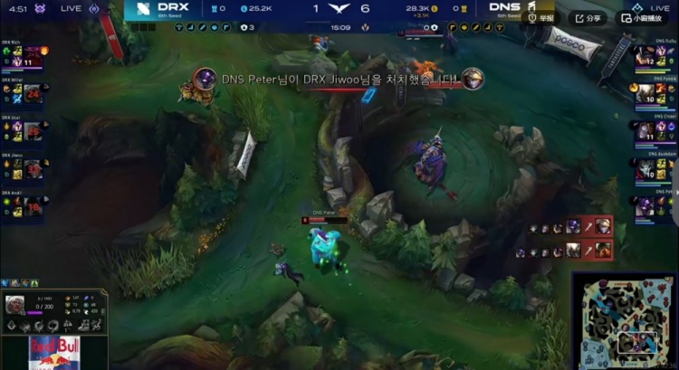 26分钟,DRX在野区强杀兰博失败,被DNS打出0换4之后收下水龙魂+大龙!随后上路DRX想强动deokdam烬但是被DuDu兰博闪现火烤+带球入场卷了三个瞬间杀死比赛,DNS团灭DRX,从上路一波结束首局!
