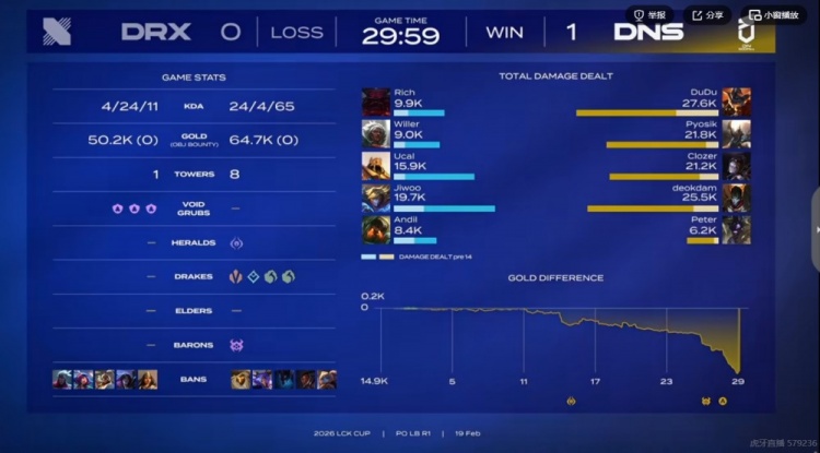 直播吧2月19日讯 2026年LCK杯季后赛继续进行中,今天进行的是败者组第一轮的比赛,DRX对阵DNS!