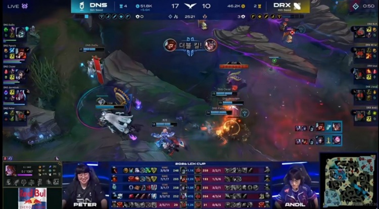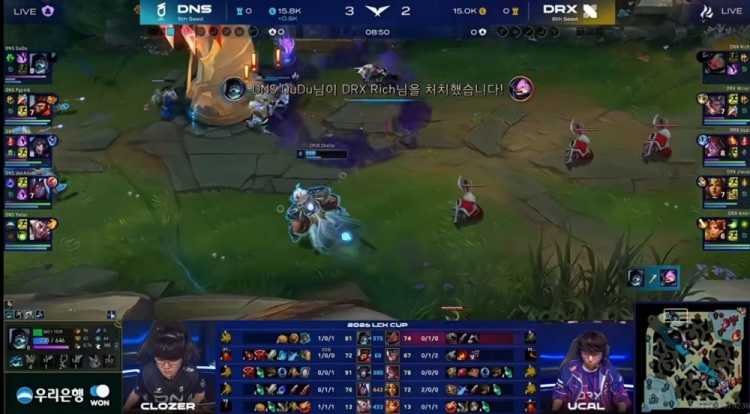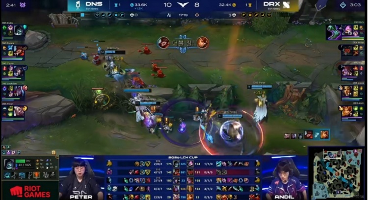 【17:10】DRX中野上路强动DuDu约里克但是伤害不够啊!DuDu交闪拉扯等到了队友支援,DNS四人反打留住了DRX野辅,Pyosik猴子双杀!随后拿下先锋的DNS直接撞了一头中一塔!