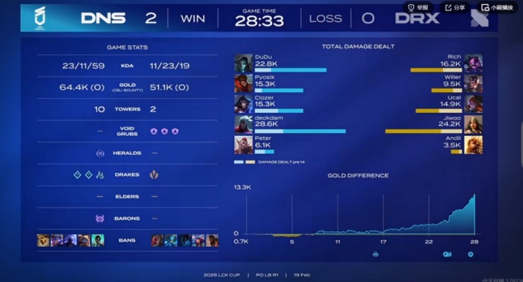 直播吧2月19日讯 2026年LCK杯季后赛继续进行中,今天进行的是败者组第一轮的比赛,DRX对阵DNS!