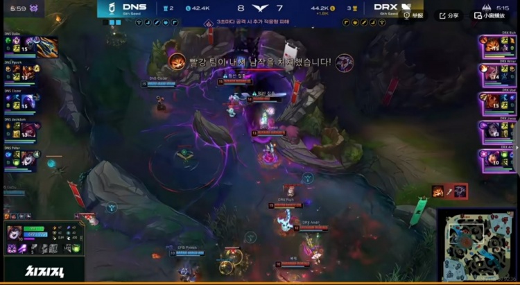 【11:42】DuDu贾克斯上路勾引对手上辅,DNS支援瞬间赶到,Pyosik皇子EQ一个盖另一个,将Rich纳尔和Andil妮蔻全部留住!这波0换2打完DNS领先1500块了!随后DRX下路越塔强动DuDu贾克斯,被对手的支援换掉了野辅两人!还好Jiwoo卡莎一个虚空索敌留住了残血贾克斯,DNS这波1换2打完还拆了对手下一塔!