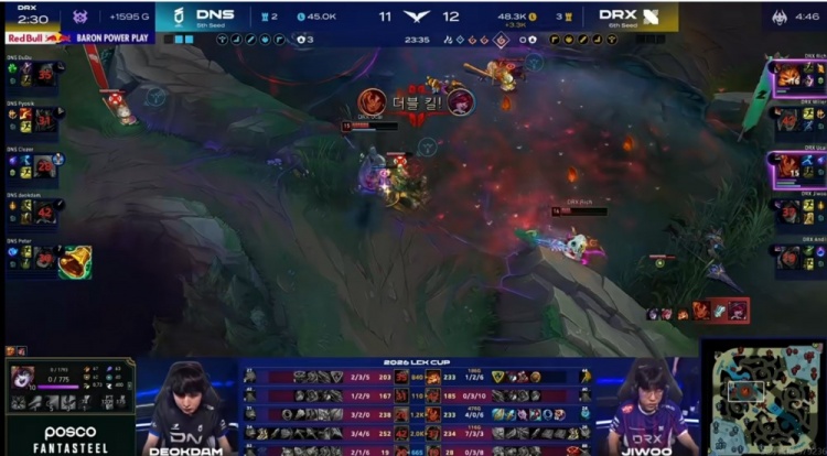 【21:58】龙魂团,Willer蔚配合Andil妮蔻双大招强锁deokdam霞将他强杀,开飞支援的Jiwoo卡莎和TP落地的Rich大纳尔配合收割了战局!这波DRX打出1换3!拿下火龙魂之后再拿大龙!残局团战卡莎开飞配合蔚锁头瞬秒Clozer瑞兹,少人的deokdam霞侧翼输出拉满,最终配合Peter璐璐大招强行换掉对手三人!ucal岩雀双杀收尾,DRX拿下大龙打了一波3换5的歼灭战!双方经济差来到4K!