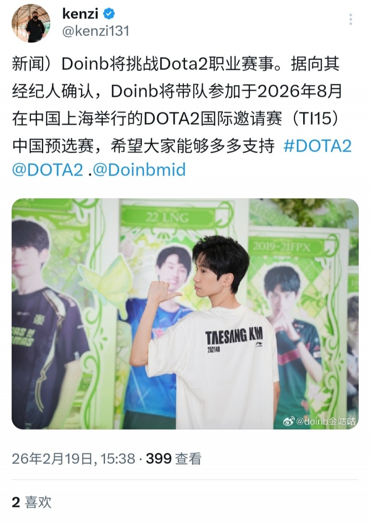 直播吧2月19日讯 今日,韩媒韩媒记者kenzi在推特上爆料称:英雄联盟S9冠军中单Doinb转型DOTA2赛事!与其经纪人确认,他将带队参加8月份在上海举办的DOTA2国际邀请赛预选赛!