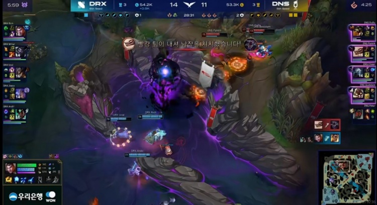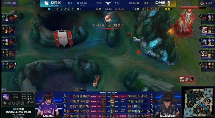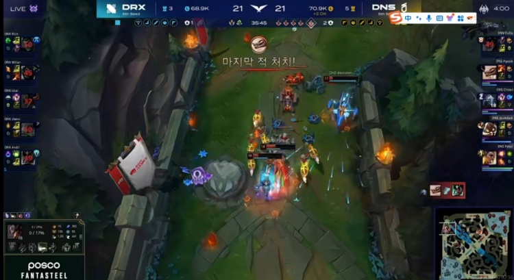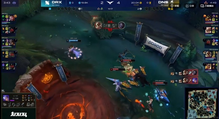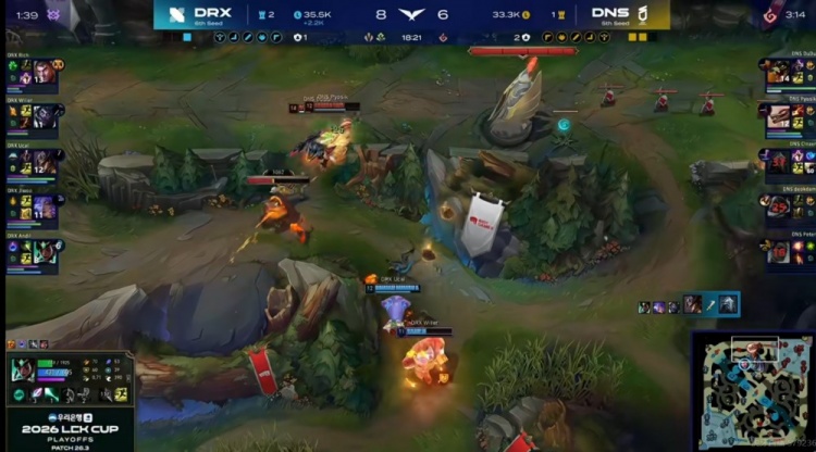 【18:20】野区DRX找到机会留住deokdam库奇,Rich杰斯炮接闪现锤配合Jiwoo芸阿娜强杀掉了库奇!DNS只能溃败!Clozer维克托也被留住,又是DRX的0换3!DRX领先3K!