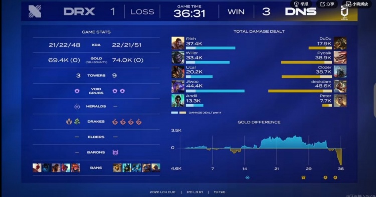 最终大龙团前DRX逮捕Peter芮尔,但是ucal卡牌一顿操作自己白给了!残局Jiwoo芸阿娜强换deokdam库奇未果,DNS双C站到了最后!DNS团灭DRX,从上路一波结束比赛,淘汰对手的同时自己晋级到了败者组第二轮!