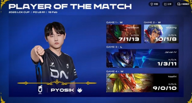 直播吧2月19日讯 2026年LCK杯季后赛继续进行中,今天进行的是败者组第一轮的比赛,DRX对阵DNS!