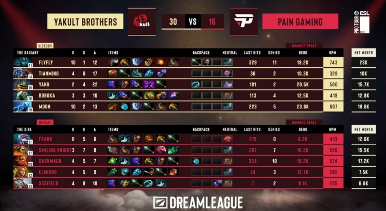 中期paiN轻松控下肉山,Smiling Knight小狗带盾上路推进,YB多人包夹过来,Smiling Knight被boboka小小扔回后盾起被MooN女王击杀,YB打出0换3,随后中路团战,YB主动动手被DarkMago雷泽三杀,paiN打出2换4推掉YB中路二塔,经济领先7k。正面团战YB根本不是paiN三大哥对手,paiN再控二代肉山,盾给到Smiling Knight小狗,但随即下路团战Smiling Knight盾换YB三个人头。随后上路paiN一四五小团体三人开送,YB打出0换4,经济劣势回到4k。好景不长,paiN下路推进击杀YB三四两人后控掉三代肉山,Smiling Knight带盾。