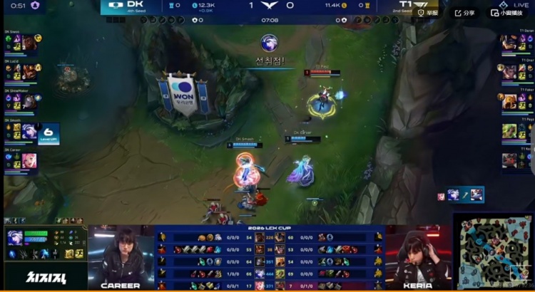 【7:12】DK下路组抓住Keria悠咪落地的机会直接给上控制和输出,两人合力线杀掉了Keria悠咪!Smash艾希一血!
