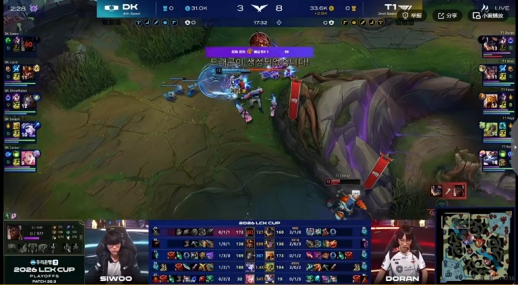 【17:35】上路Doran兰博找到机会,直接对位单杀掉了Siwoo奎桑提,TP落地的SMK许哥终于拿到了击杀!不过正面拿下先锋的T1已经带着先锋几乎拆掉了对手的中路双外塔!双方经济差被扩大到快4K了!T1还可以拿下第二条小龙!