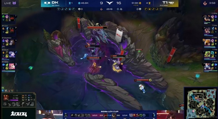 【14:00】T1下路组在上路逮捕了SMK发条,但是Faker沙皇中路推空,被DK下路组+打野三人联手逮捕!中单的1换1!