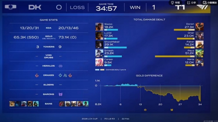 直播吧2月22日讯 2026年LCK杯季后赛来到关键的败者组半决赛,T1和DK的胜者去中国香港,败者被淘汰!