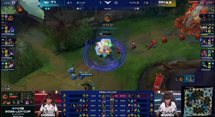【6:25】Doran鳄鱼上路留住Siwoo奥拉夫,Faker卡牌交大包上完成gank!Doran鳄鱼的一血!