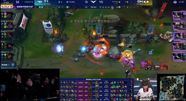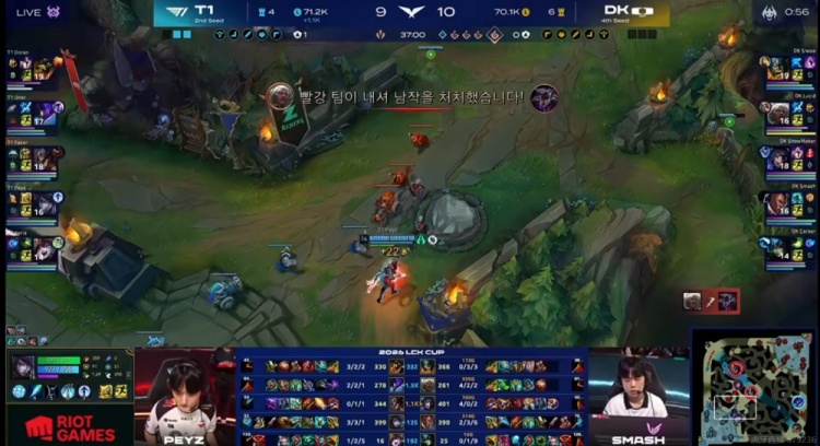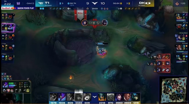 【19:06】下路T1上野强杀Siwoo奥拉夫,随后Faker卡牌交大劝退DK在中路的压制,Smash卢锡安还被迫交了闪和Career娜美大招才跑得掉!DK回头拿下先锋,但是下二塔已经被Doran鳄鱼给拆掉了!双方经济差接近4K!