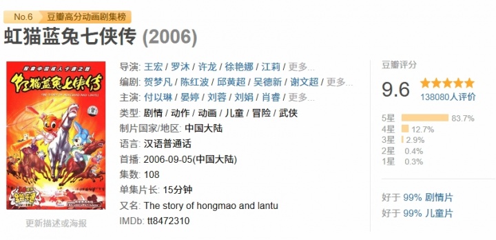 《虹猫蓝兔七侠传》于2006年9月5日在中央电视台少儿频道首播,2026年正值开播20周年。豆瓣评分高达9.6分。