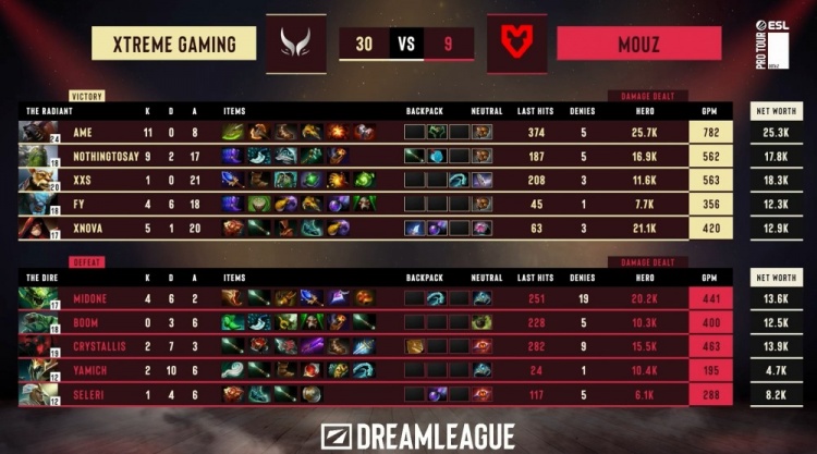 天辉方XG:Ame拍拍、NothingToSay小小、Xxs酒仙、fy白牛、xNova术士