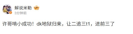 LCK杯季后赛DK让二追三击败T1,解说米勒发文: