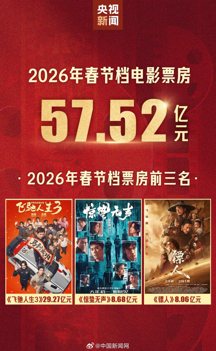 据国家电影局统计,截至今日9:00,2026年春节档票房为57.52亿元,观影人次为1.20亿。
