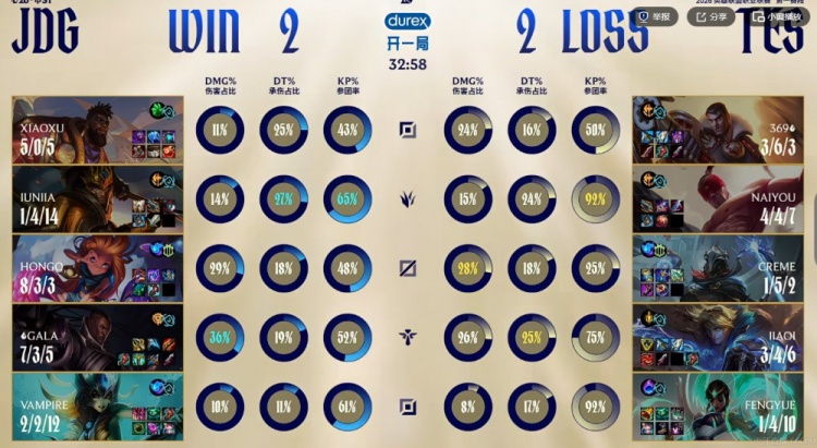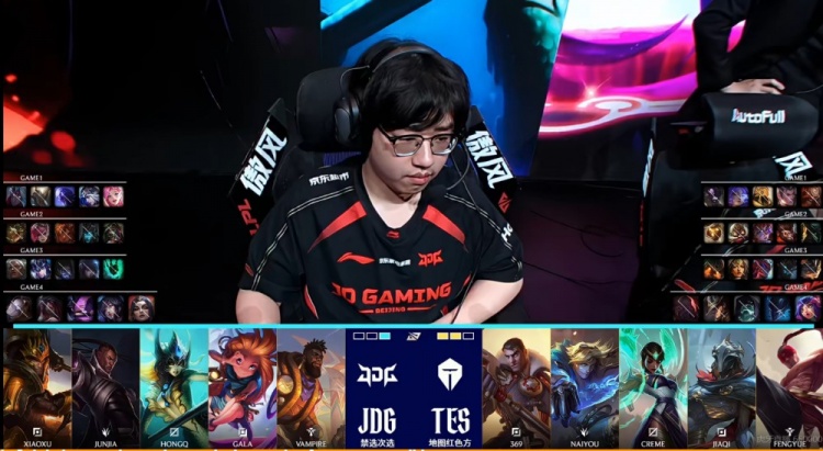 关键的龙魂团HongQ佐伊连续睡眠气泡命中TES下野,JDG追击团灭TES之后拿下土龙魂!最终中路团Junjia皇子复活甲在手舍命开团,Fengyue卡尔玛倒下之后HongQ佐伊睡眠气泡又找到了369杰斯。JDG打出0换3,中路一波结束比赛,将本场BO5拖入了最终的决胜局!