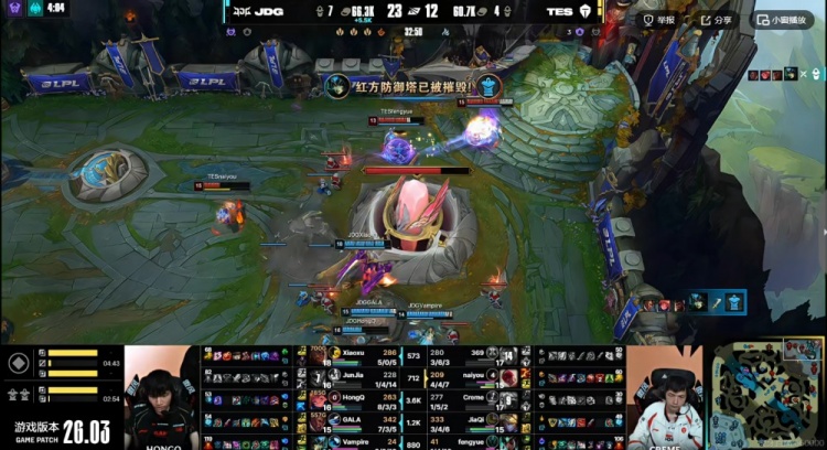 【5:20】TES三人越下但是Vampire娜美水泡命中了Fengyue卡尔玛,正面过热防御塔配合GALA卢锡安打出1换2!Fengyue卡尔玛换掉卢锡安之后自己被支援的HongQ佐伊收掉!同时上路Junjia皇子再次越塔强杀369杰斯!相当于JDG的2换4!