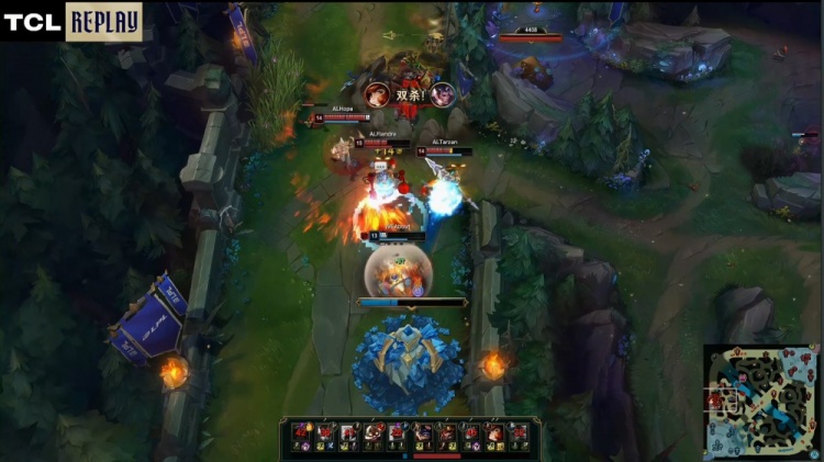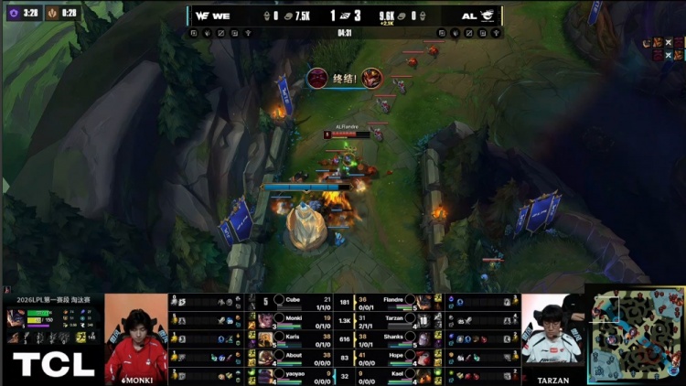 【3:11】Monki赵信来中gank逼迫Shanks发条进WE野区,河道双方打野开战,双方中单支援过来,正面肉搏Tarzan与Shanks各取一个人头,AL打出0换2。