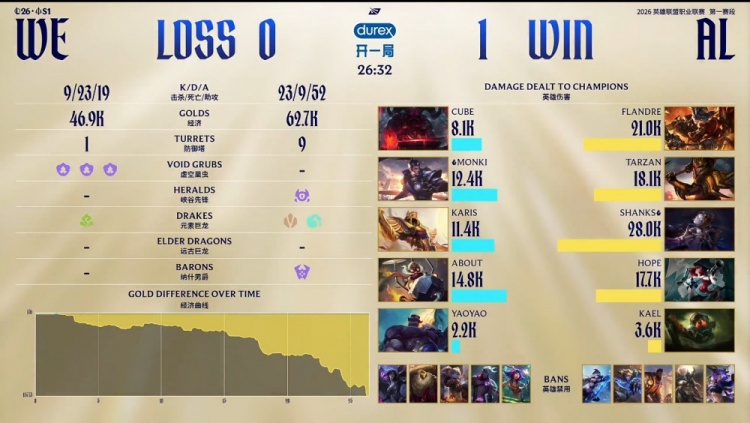后期AL上路推进,Karis沙皇推三人无济于事,AL瞬间1换5团灭WE并拿到大龙,经济领先超过1w。最终AL冲上WE高地轻松推平基地先下一城。