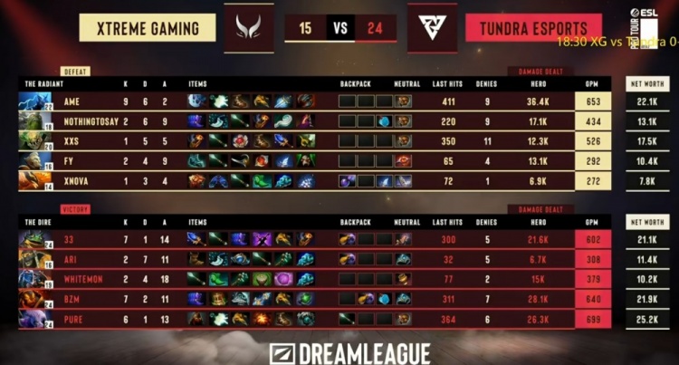 首局比赛XG放出33绝活朗戈,Tundra还后选火猫中单对线压住了NTS小小!虽然XG依靠孽主前期掌握节奏,但是Ame剃刀被两次强杀成了伏笔!中期XG一度领先6K经济,但是一波下路团强杀虚空未果,被33朗戈带队完美拉扯反杀四个!Tundra后续带盾之后掌握比赛主动权,XG阵容没有经济优势正面只有一号位剃刀一个输出点完全没输出!哪怕是Pure虚空大招效果一般,Tundra团战都是随便打!最终二代盾团XG被Tundra团灭敲出GG!